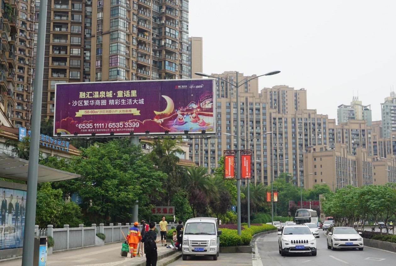 該廣告位位于沙坪壩區(qū)沙濱路,沙濱路是沙坪壩、渝中區(qū)、江北區(qū)三地往來的主要交通要道,該路段環(huán)境單純、地勢平坦、視野開闊;車流量大、廣告視覺沖擊力強、受眾目標廣泛、廣告信息發(fā)布效果突出,是各企業(yè)、事業(yè)單位提高知名度和推廣產(chǎn)品的首選之地。
