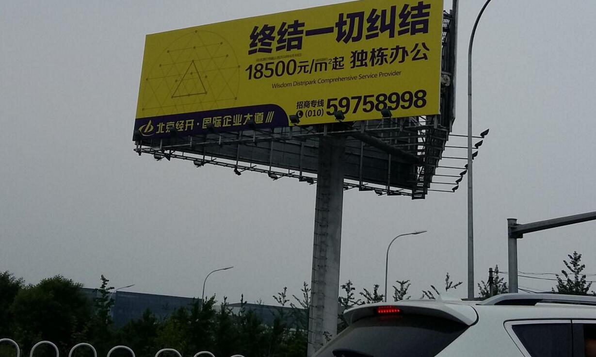 | 亦莊單立柱廣告 媒體位置: ?①五環(huán)路與榮華橋交界處東西兩側 媒體規(guī)格:18m*6m*3面 ? ?②亦莊西環(huán)路與榮京西街交界處南北兩側 ?③亦莊西環(huán)路與榮昌西街交界處南北兩側 ④亦莊東區(qū)科創(chuàng)五街與經(jīng) 海一路交界處兩側 |