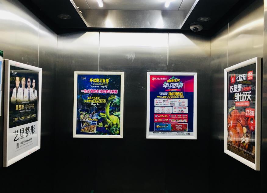電梯廣告類型多樣,以商務電梯、樓宇電梯為主,表現形式主要為在電梯轎廂內安裝成相框的形式,還有一種是在電梯門上直接安裝廣告。