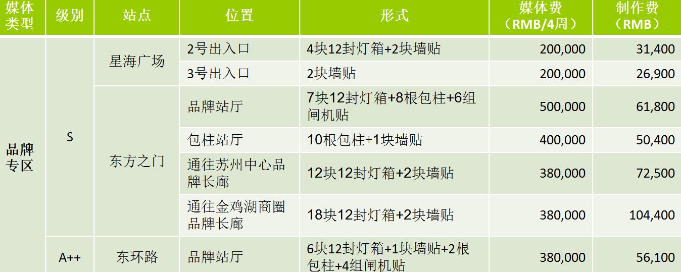 | 蘇州地鐵12封燈箱 級(jí)別 S:媒體費(fèi)(RMB/4周/站) 72,000元 A++:媒體費(fèi)(RMB/4周/站)58000元 A+:媒體費(fèi)(RMB/4周/站)35000元 A:媒體費(fèi)(RMB/4周/站)28000元 制作費(fèi):950元 ? |