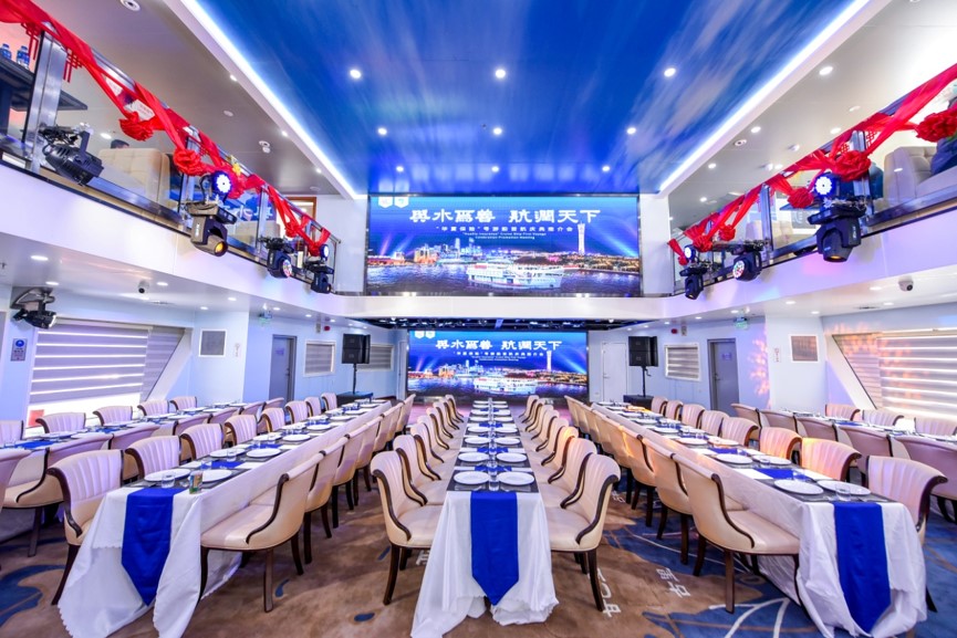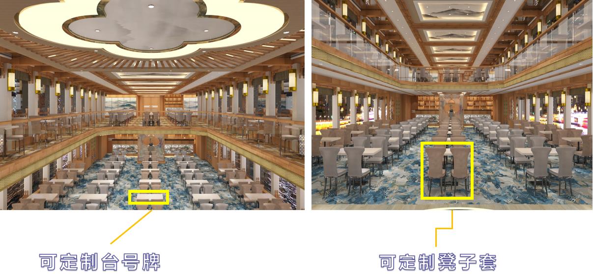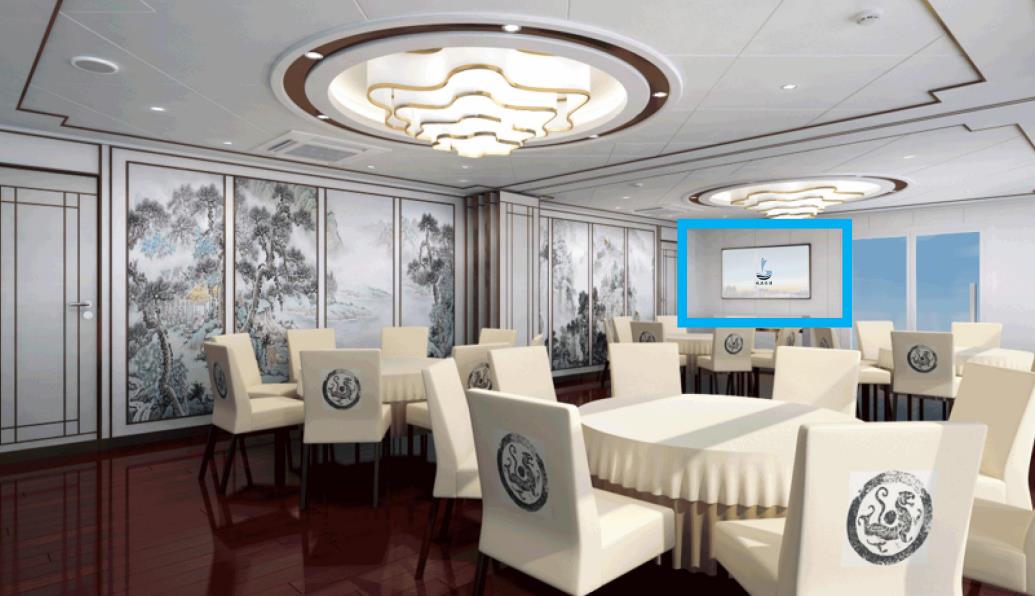 游船內(nèi)部廣告位:圓桌式坐席區(qū)分布1個橫版廣告展示位