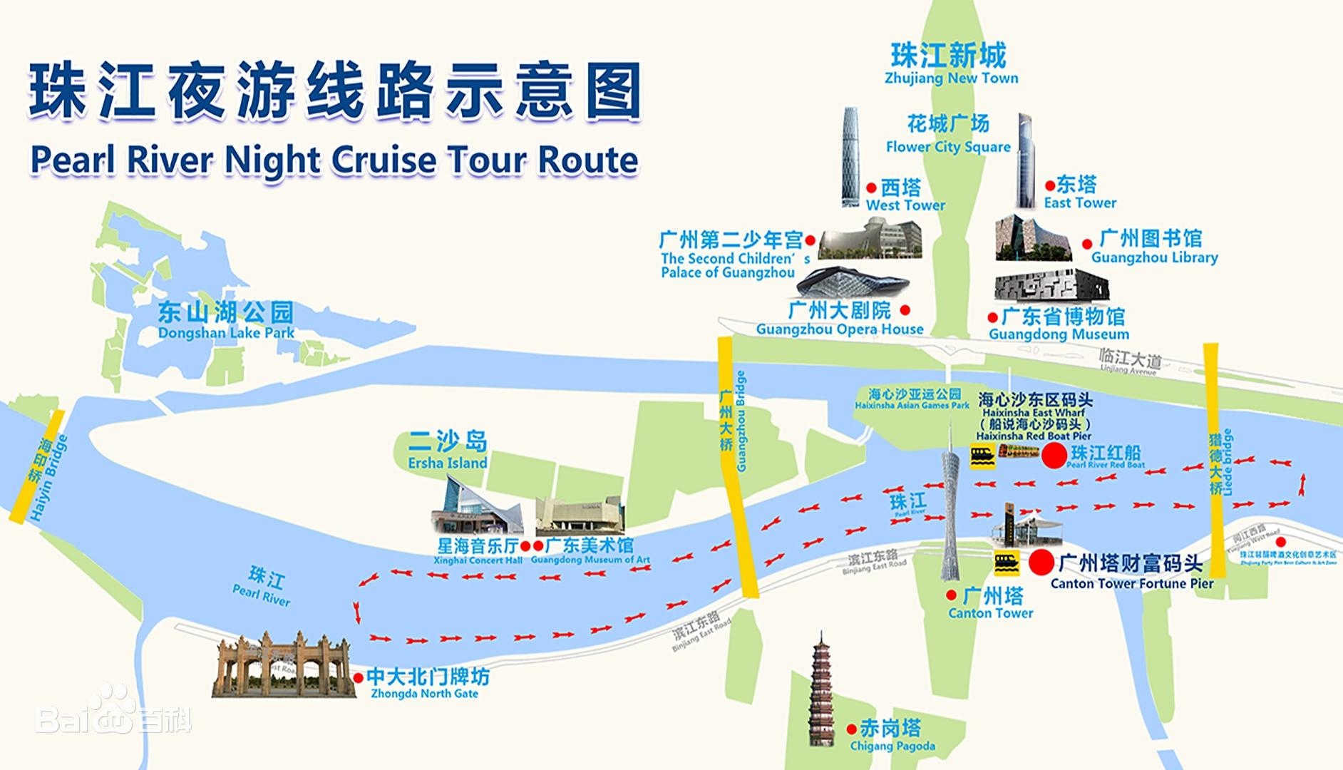 【常規(guī)全線】 大沙頭碼頭→江灣大橋→海印橋→解放橋→人民橋→白天賓館→白鵝潭返航海印大橋→星海音樂廳→廣州大橋→廣州電視塔→海心沙→獵德大橋→琶醍→二沙島→大沙頭碼頭
