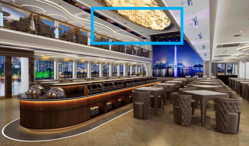 游船內(nèi)部廣告位:二樓開放式坐席區(qū)兩側(cè)分布2個橫版廣告展示位