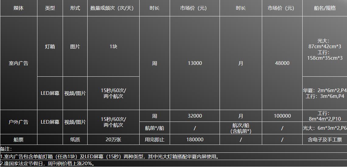 媒體形式:視頻循環(huán)播放(最少60次/天/船,片長10分鐘內(nèi))