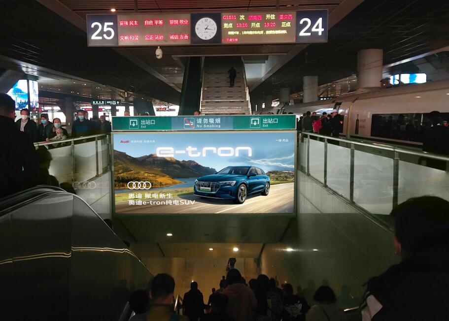 | 西安北站廣告 站臺層出站落地燈箱(16-27站臺) · 12塊 媒體尺寸(寬x高x面):5.5518㎡ ( 4.87m x1.14 m× 1面) 投放形式:6塊/組 媒體價值: 1、此媒體處于站臺層樓梯口正中間,覆蓋整個站臺層進站、出站的人群,視覺沖擊力強,彰顯企業實力與形象; 2、聯排投放彰顯品牌形象,可全方位、全過程、無縫隙覆蓋上車、下車所有旅客,提高有效曝光率。 |