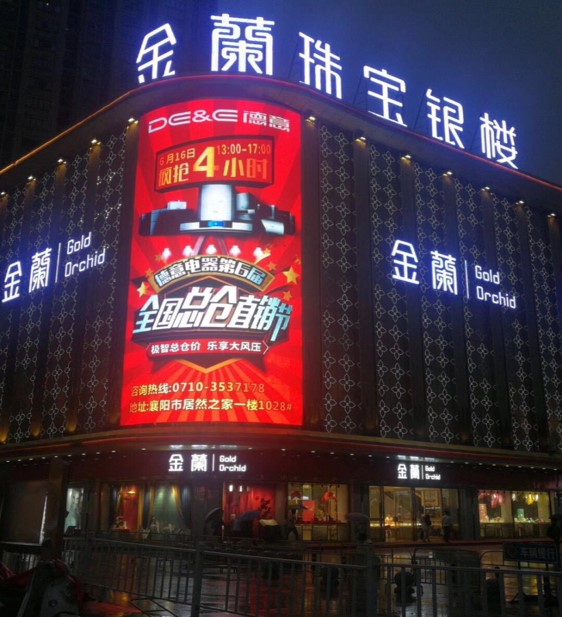 金蘭珠寶大廈LED彩屏采用我國制造LED最大上市公司最優質的產品,高亮度,高灰度,色彩艷麗又極具柔和性,廣告沖擊力強,媒介傳播快捷,受眾面廣。
