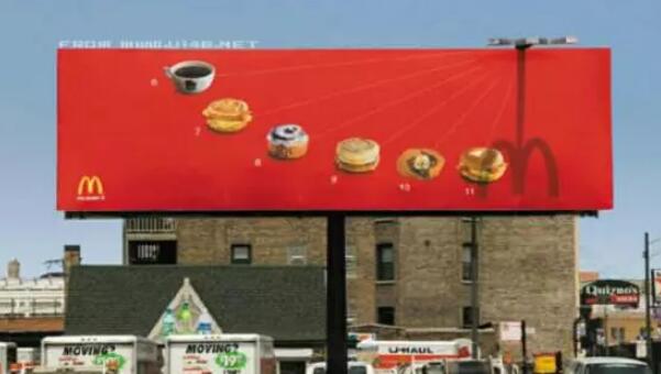 麥當勞是芝加哥的快餐一哥,在麥當勞打出的廣告里,最讓人有深刻印象的就是一個個性十足的大型時鐘廣告牌“日晷”,麥當勞在街道的一屋頂上設計了一個大型的時鐘,在12個小時刻鐘上分別放置了代表每一個時間點的麥當勞典型快餐,這樣的圖案效果,讓人在每一個時間都能想到麥當勞,廣告的宣傳效果非常突出。