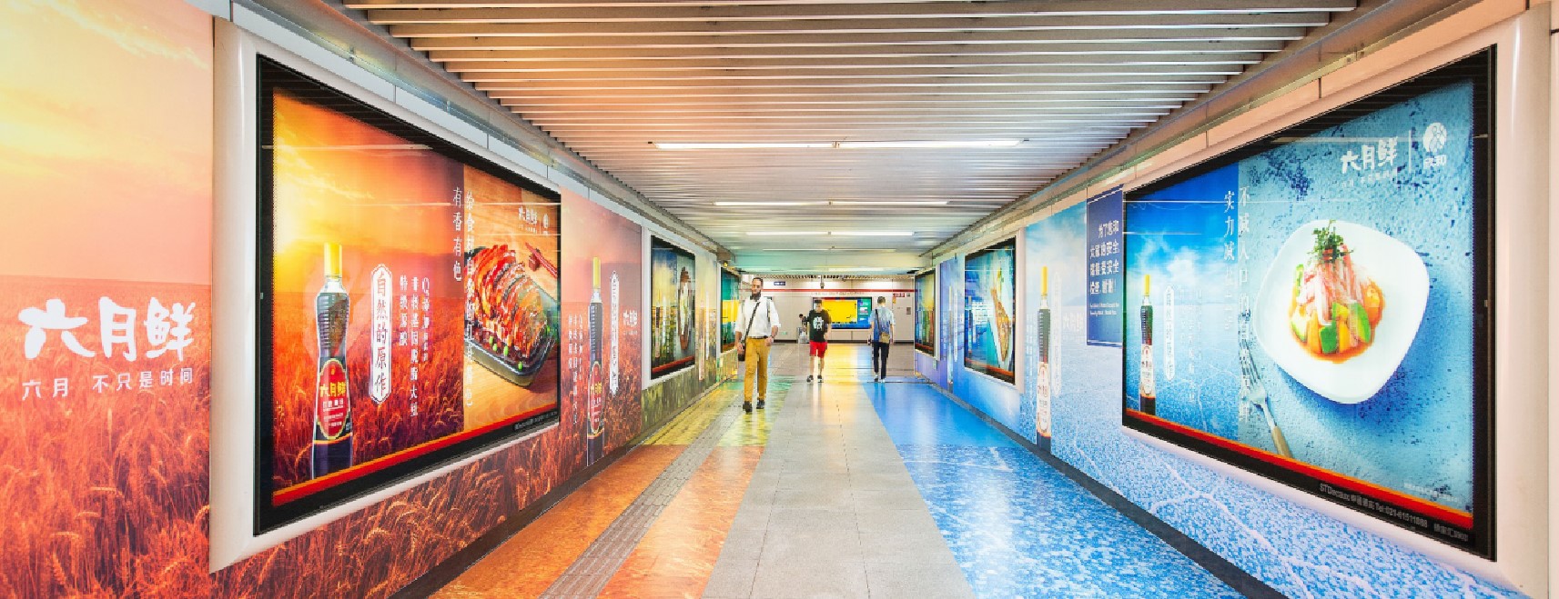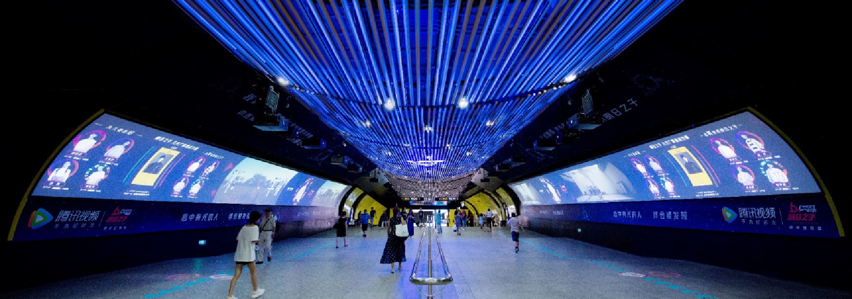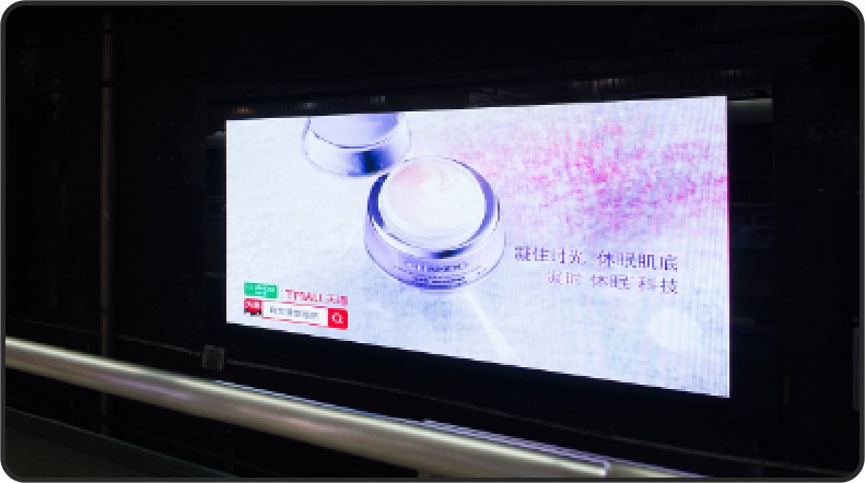 由 電子屏 與 超級動感燈箱,相互交錯組成的電子媒體通道,大面積的靜態海報與高精度的動態畫面不斷沖擊乘客視覺;頂部天花板與通道內柱體的鏡面環境設計從空間上帶來沉浸式的3D體驗;每個區域的定向音響環繞聲系統 從聽覺上刺激乘客的感官體驗 ,日均客流達55萬*人次 支持動畫、TVC、電子海報等,可制作各種大型創意效果