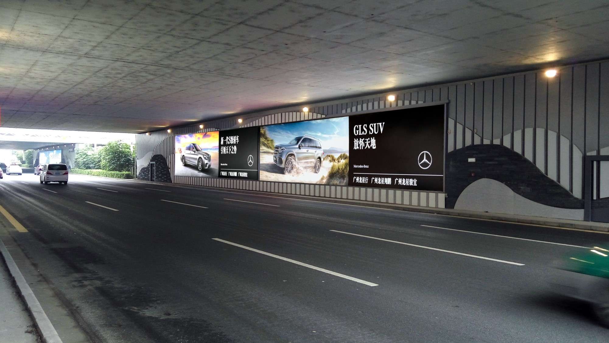 ①機場航站樓前,飛機滑行橋下兩側橋身墻體 。