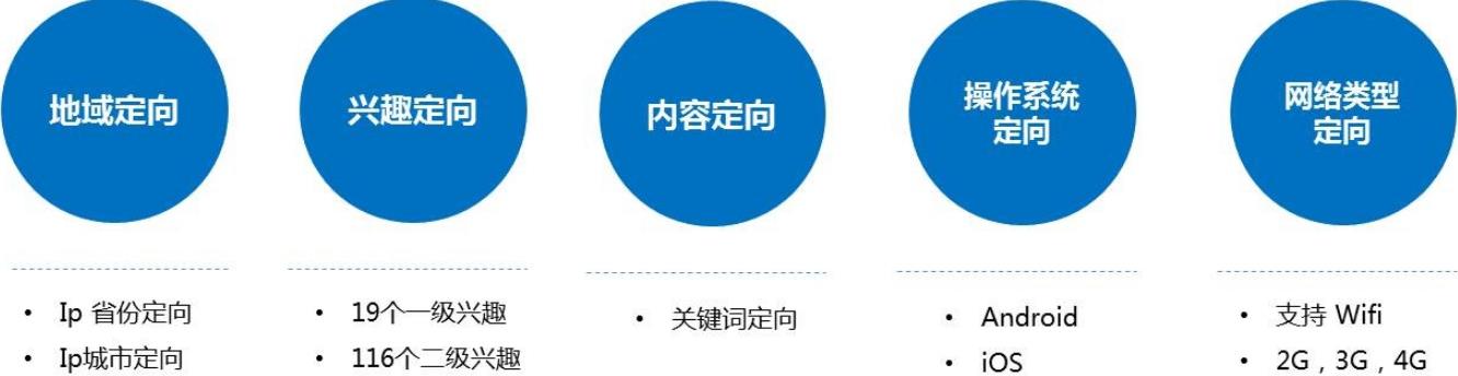 目前開放上線4個維度定向,分別是地域定向、興趣定向、內容定向、操作系統定向、網絡類型定向,
