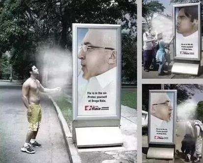 比如巴西QG公司為巴西著名藥品連鎖店Droga Raia創(chuàng)作的公益性廣告。通過(guò)在廣告箱里安裝的噴霧設(shè)備和巧妙的視覺(jué)設(shè)計(jì),讓蒸汽就像噴嚏一樣從模特的鼻孔噴出。當(dāng)人們懷著好奇走近時(shí)會(huì)看到:“流感就在空氣中。保護(hù)好自己。”下面是Droga Raia連鎖店的標(biāo)志。好奇的路人可以躬身細(xì)看究竟,也可以伸臉體驗(yàn)一下噴霧。