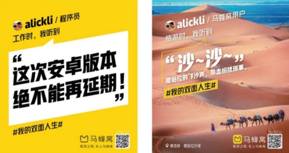 近日,北京地鐵1號線、2號線、10號線等十余條線路上,陸續出現了馬蜂窩旅游網的新版地鐵廣告。與近兩年常出現在人們視野中的標志性品牌黃略有不同,這次廣告的主角是馬蜂窩的用戶們。廣告以“我的雙面人生”為主題,詮釋了當代年輕人在工作中與旅途中展現出的不同自我,同時也體現出馬蜂窩作為一個年輕化旅游平臺的個性與多元。