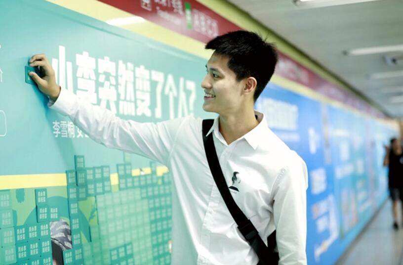 在地鐵通道廣告兩邊, 6張巨幅海報被銀行卡大小的卡片層層覆蓋,只在上方露出夸張的費解的文案:“小劉面臨重重誘惑?”、“小李突然變了個人?”、“小付突然驚聲尖叫”……對于來往人群來說,被遮住的畫面,懸念性的文案,讓人忍不住想“動手”親自揭牌翻出答案。在早高峰的換乘東單站,不少行色匆匆的上班族們在此停駐,或揭下覆蓋在海報上的卡片一探究竟,或在一旁圍觀謎底。短短半天內,6幅青春搶眼的“大玩卡”海報便被接力“解密”。