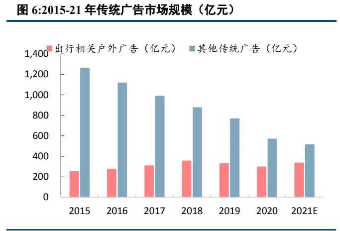線下廣告市場規模有所回落,但結構性機會仍存。2013-20 年全國傳統廣告規模自 1762 億元下降至 864 億 元,降幅為 52.7%;相較而言,網絡廣告自 1105 億元增長至 7666 億元,增幅 593.8%。傳統廣告規模的流失主 要是用戶注意力向移動媒介轉移,表現為用戶上網時長占比提升,而其他活動的時長占比相對下降。但居民時 間結構上,出行相關時長占比提升,出行圈廣告可能存在結構性機會。
