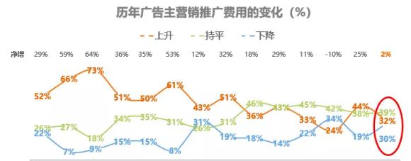 根據(jù)CTR發(fā)布的《2022中國廣告主營銷趨勢調(diào)查》報告, 2022年,廣告主營銷預算凈增比例出現(xiàn)收窄。32%的廣告主營銷費用上升,明顯低于去年的44%,而降低營銷費用的廣告主則占30%,較去年增長11%。