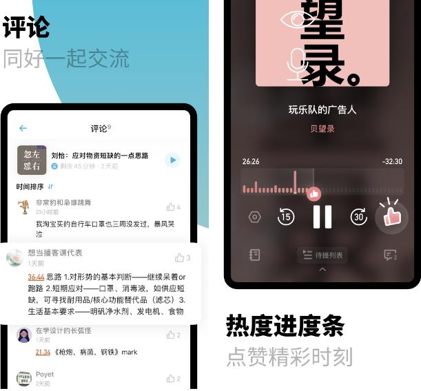 界面特別清新,比其它APP界面簡潔,可以根據(jù)聽到哪一段進行評論,評論區(qū)有很多令人感同身受的觀點。 —— 南城以南溫暖如初 統(tǒng)計收聽時長這個功能最滿意。