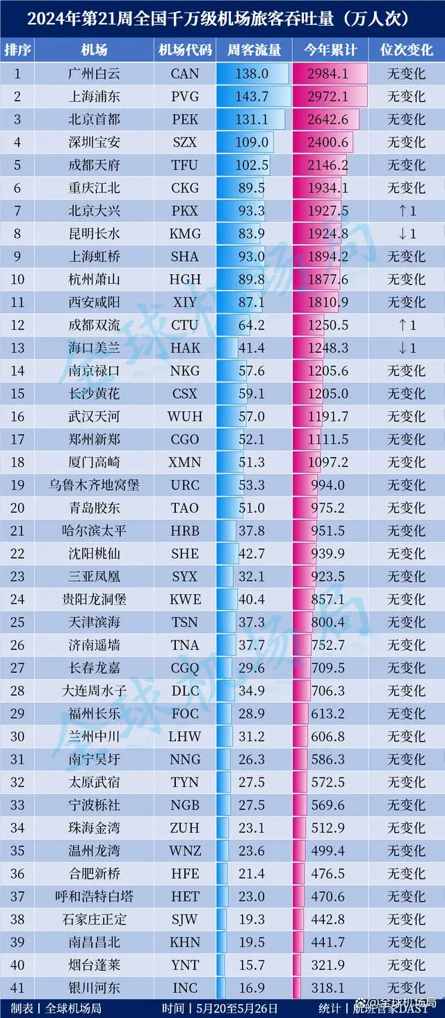 2024年第21周全國(guó)千萬(wàn)級(jí)機(jī)場(chǎng)旅客吞吐量出爐!(第21周:5月20日至5月26日)上海浦東機(jī)場(chǎng)以143.7萬(wàn)人次的周客流量連續(xù)8周拿下首位,與上周相比,客流量減少了2.4萬(wàn)人次。從累計(jì)客流方面來(lái)看,上海浦東機(jī)場(chǎng)將其與廣州白云機(jī)場(chǎng)的差距進(jìn)一步拉近至12萬(wàn)人次。北京大興機(jī)場(chǎng)則是在第21周實(shí)現(xiàn)了對(duì)昆明長(zhǎng)水機(jī)場(chǎng)的反超,將累計(jì)客流的排名提升至第7位。成都雙流反超了海口美蘭,全國(guó)排名提升至第12位。