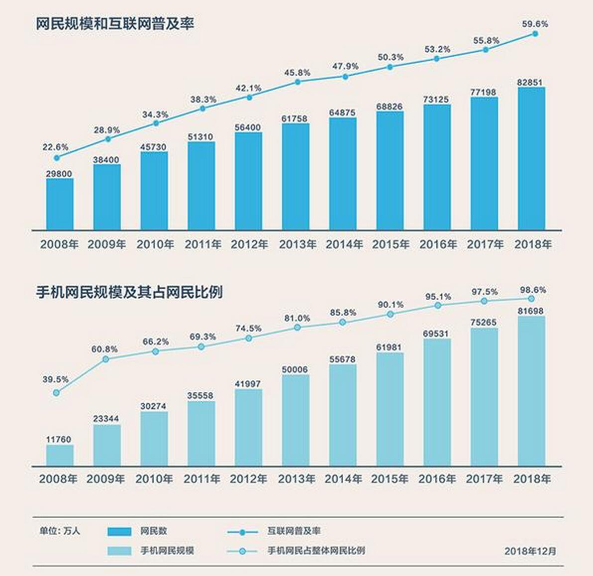 2019年2月28日,中國(guó)互聯(lián)網(wǎng)絡(luò)信息中心(CNNIC)發(fā)布第43次《中國(guó)互聯(lián)網(wǎng)絡(luò)發(fā)展?fàn)顩r統(tǒng)計(jì)報(bào)告》。報(bào)告顯示,截至2018年12月,我國(guó)網(wǎng)民規(guī)模為8.29億,其中手機(jī)網(wǎng)民占比達(dá)98.6%,互聯(lián)網(wǎng)普及率達(dá)59.6%。上圖為網(wǎng)民規(guī)模和互聯(lián)網(wǎng)普及率。下圖為手機(jī)網(wǎng)民規(guī)模及其占網(wǎng)民比例。